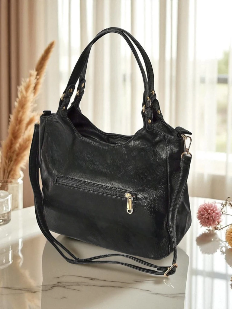 La borsa da donna nera Callista è sinonimo di eleganza e praticità in uno. Realizzata in pelle ecologica accuratamente selezionata con una texture delicata, combina alta qualità e design moderno. Il processo di produzione si basa su tecniche di cucito avanzate e una precisa attenzione ai dettagli, che garantiscono durata e soddisfazione nell'uso. La pelle ecologica utilizzata per realizzare la borsa è certificata per la sua compatibilità ambientale e la sicurezza per la pelle dell'utente.Il design Callista, ispirato alla forma classica del design italiano, offre comfort grazie a due diversi manici: a spalla e a tracolla, oltre a un'ampia capacità (42x24x15 cm), ideale per tutti i giorni e per il lavoro. L'organizzazione interna ben studiata comprende diverse tasche con zip e uno spazio principale funzionale foderato con un materiale resistente, che fornisce il luogo ideale per portafoglio, telefono, cosmetici e altri piccoli oggetti essenziali.Vantaggi della borsa Callista:- Pelle ecologica di alta qualità: un materiale con un aspetto classico e nobile, facile da pulire e resistente ai danni.- Leggera e capiente: pesa solo 2520 g e può contenere tutti gli oggetti essenziali di tutti i giorni.- La chiusura sicura con cerniera garantisce la protezione del contenuto.- Dettagli decorativi, come il ciondolo a farfalla lucido, aggiungono un fascino sottile.Idee per lo styling:1. Ufficio e incontri di lavoro: abbinala a un blazer classico e una gonna a tubino: Callista aggiungerà un tocco professionale al tuo outfit.2. Uscite di tutti i giorni: abbinala a jeans, una t-shirt e un cappotto leggero: un'opzione comoda ed elegante per lo shopping o una passeggiata.3. Incontri serali: abbinala a un vestito e tacchi alti: i dettagli lucidi metteranno in risalto l'eleganza del tuo outfit.Cura e conservazione:Per garantire che la borsa Callista duri per anni, si consiglia di pulirla regolarmente con un panno umido ed evitare il contatto con oggetti appuntiti. Conservala in un luogo asciutto, utilizzando un sacchetto protettivo. In caso di sporco più ostinato, utilizzare detergenti delicati progettati per la pelle ecologica.Tendenze della moda:La borsa in una profonda tonalità di nero è un accessorio senza tempo che si adatta alle attuali tendenze minimaliste ed eco-compatibili. Minimalismo, forme semplici, decorazioni delicate e comfort d'uso: questi sono gli elementi di stile che dominano le ultime collezioni dei designer mondiali. Il modello Callista si adatta perfettamente sia agli outfit di tutti i giorni che a quelli più eleganti.