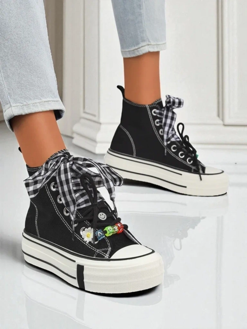 - Adidași moderni din material textil, cu talpă groasă. Decorați cu șireturi și mărgele colorate. Confortabili, ușori și stilați – ideali pentru ținutele urbane și purtarea de zi cu zi. Confort și trend într-un singur pas.