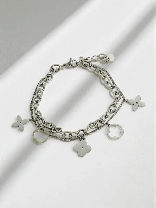 - Brățară elegantă Calista argintie din oțel inoxidabil cu pandantive florale – un accesoriu la modă pentru orice ocazie.