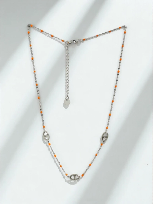 Colierul Callista Argento este un accesoriu unic, realizat din oțel inoxidabil de înaltă calitate, decorat cu mărgele de sticlă portocalii și motive decorative „ochi”, care atrag atenția și adaugă un caracter original stilului. Oțelul inoxidabil se remarcă prin durabilitate și rezistență la matuire și coroziune, astfel încât te poți bucura de strălucirea colierului tău pentru o lungă perioadă de timp. Mărgelele de sticlă au fost aplicate cu precizie pe toată lungimea lanțului, iar fiecare detaliu a fost finisat manual pentru a asigura cea mai înaltă calitate a execuției. Produsul nu conține nichel, deci este sigur și pentru persoanele cu piele sensibilă.