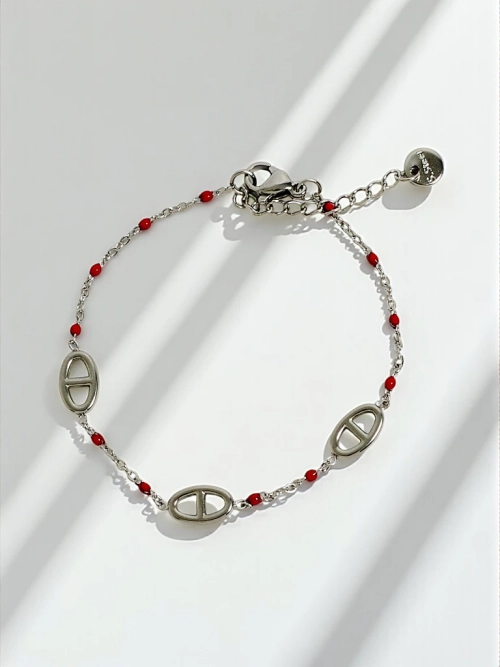 • Brățară delicată din argint 925 cu mărgele roșii și un motiv inspirat din Grecia antică.