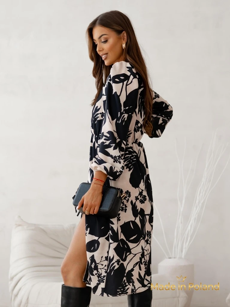 Rochie Apollonia Midi Bej cu Mânecă Lungă și Model Floral