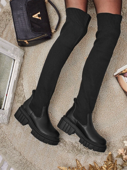 - Cizme elegante de damă peste genunchi, cu toc plat. Partea superioară este confecționată dintr-un material textil elastic, cu inserții din piele ecologică, iar în interior are o căptușeală textilă. Model slip-on. Perfecte pentru ținutele de toamnă de zi c