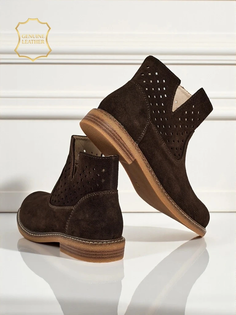 Botine Ariadne din piele naturală de căprioară maro închis, tocuri plate de 3 cm