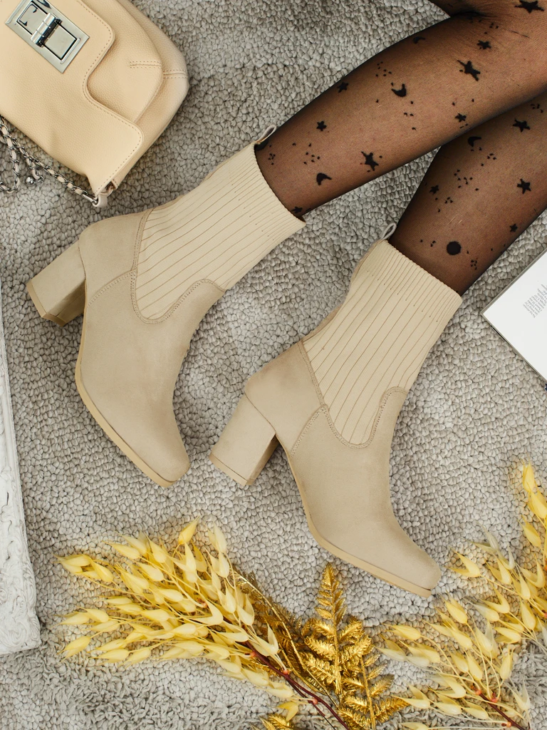 Botine de damă din piele ecologică întoarsă cu toc gros și inserție tip șosetă LumenThorn