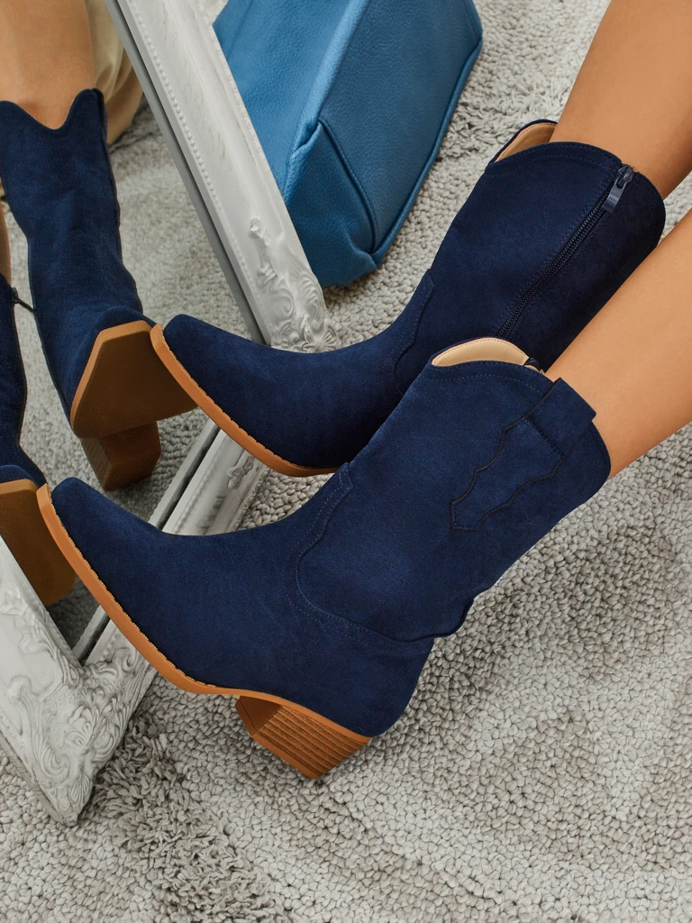 - Botine cowboy cu toc plat, confecționate din piele ecologică întoarsă. Au branț din material textil și se închid cu fermoar. Se potrivesc cu multe stiluri feminine!