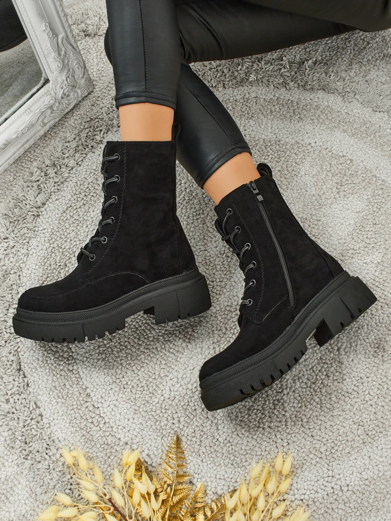 • Botine workery dama înalte din piele ecologică întoarsă, cu șireturi și fermoar. Model cu talpă mai înaltă, cu blăniță delicată în interior. Alegerea ideală pentru vremea rece!