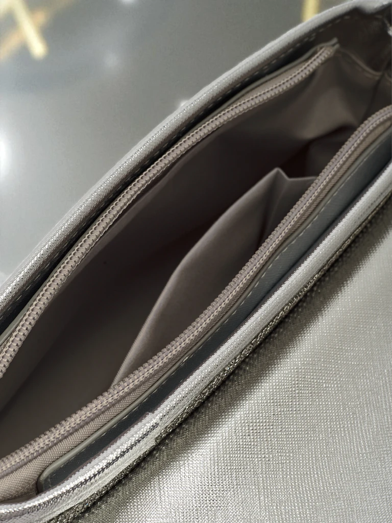 • Eleganță plic cu zirconii strălucitoare, 1 compartiment, se închide cu fermoar. Mânerele elegante și lanțul decorativ adaugă șic. Ideală pentru ocazii speciale - strălucește cu stil!