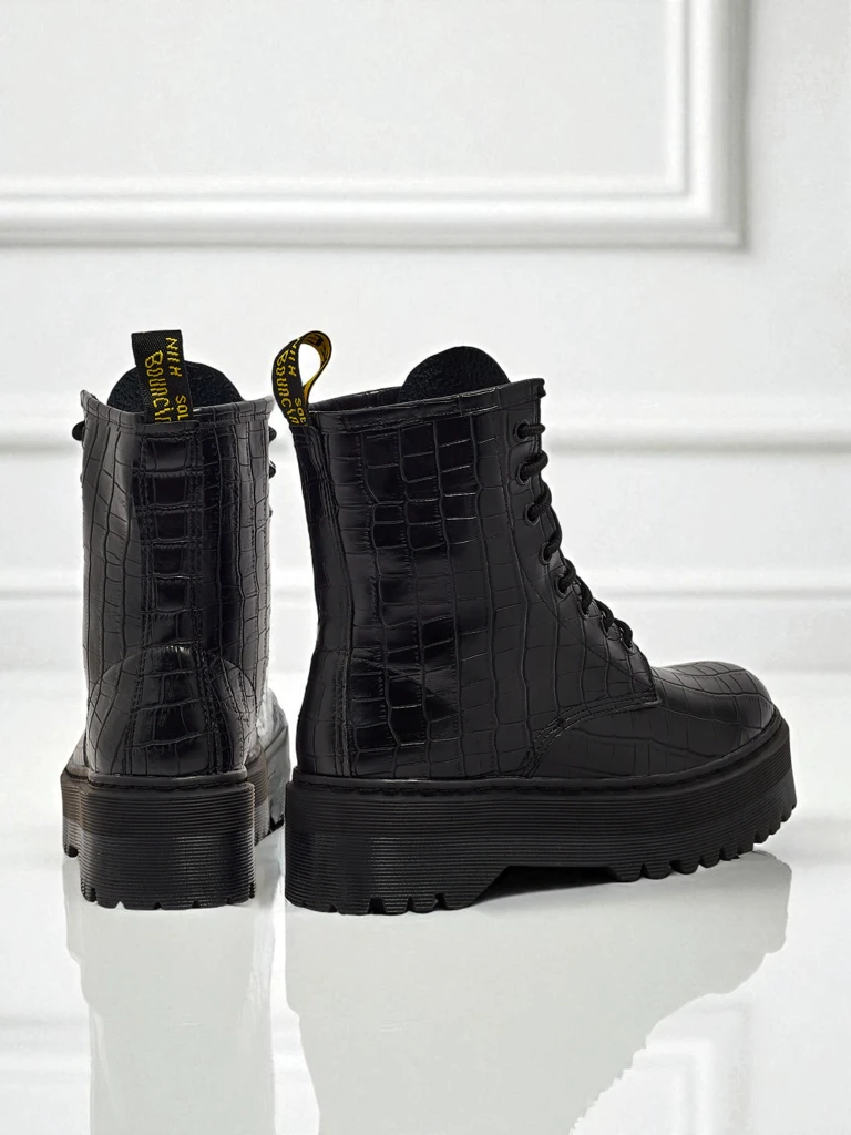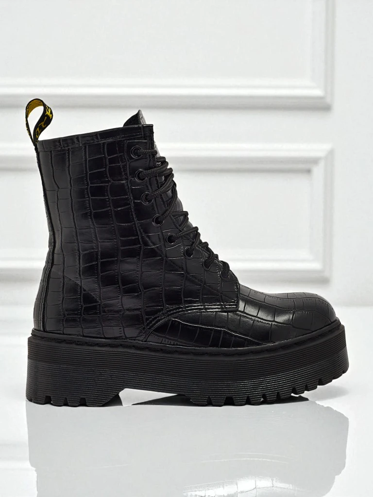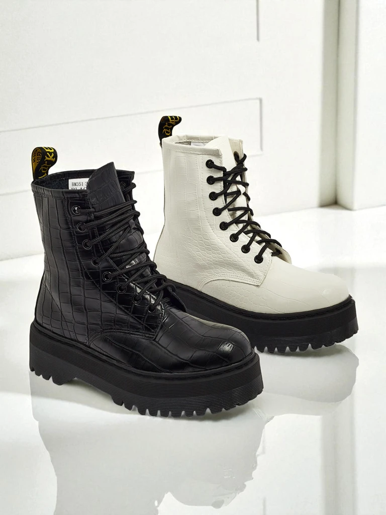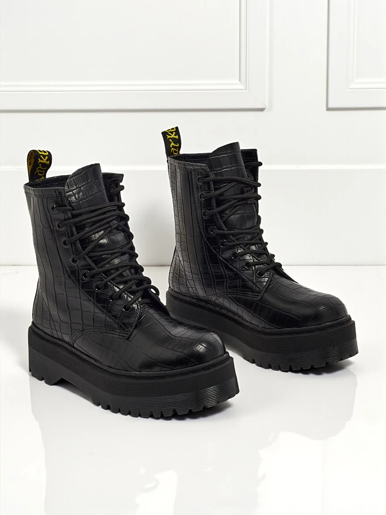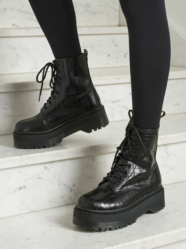 - Botine workere înalte de damă din piele ecologică, cu șireturi. Model cu platformă, interior din material textil. Alegerea ideală pentru vremea rece!