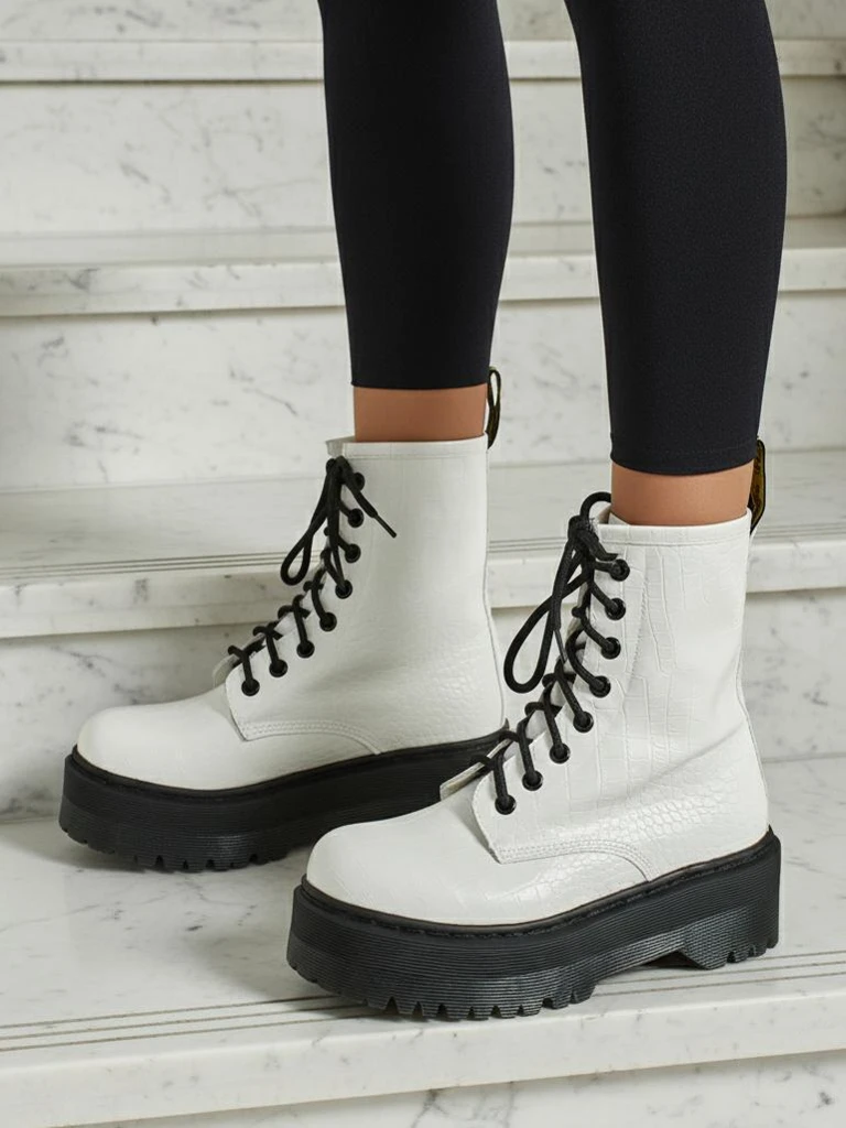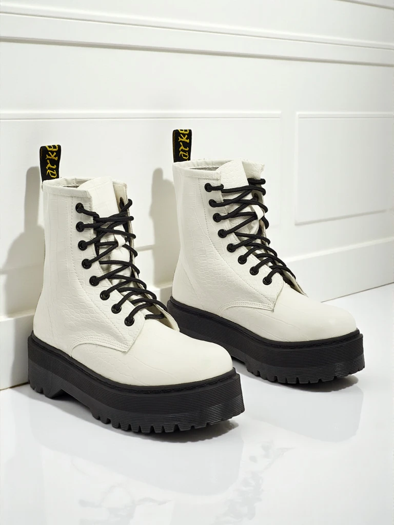 - Botine workere înalte de damă din piele ecologică, cu șireturi. Model cu platformă, interior din material textil. Alegerea ideală pentru vremea rece!