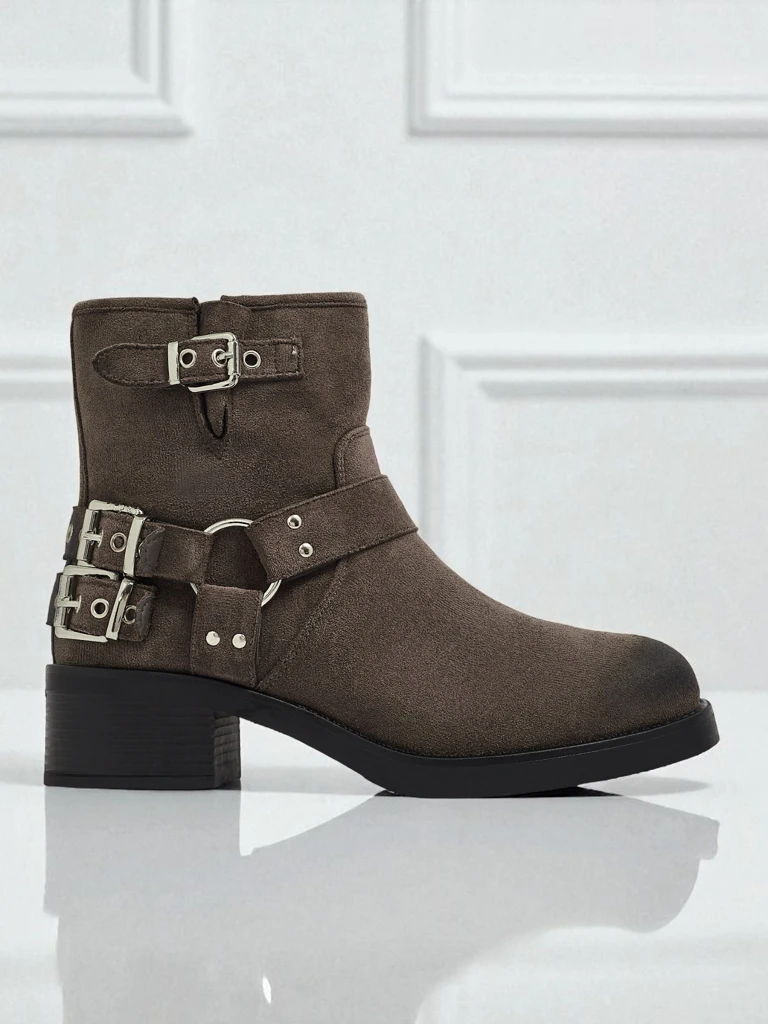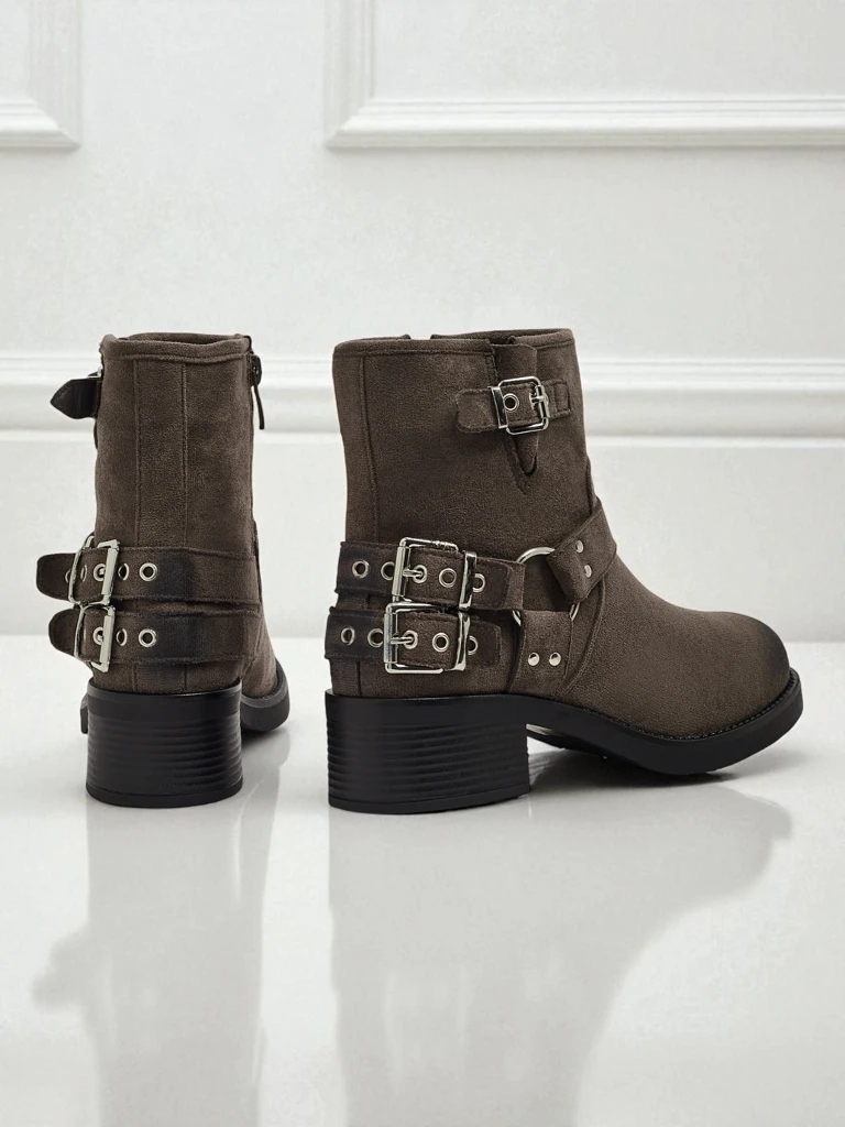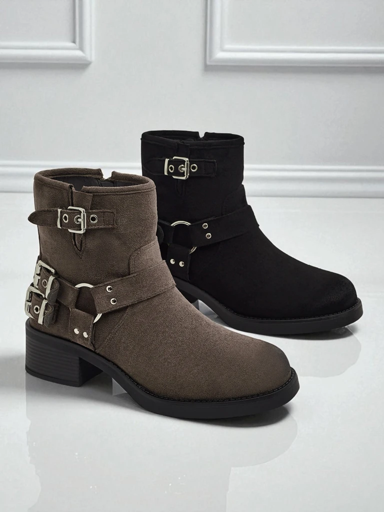• Botine de damă din piele ecologică întoarsă cu catarame. Căptușite cu blăniță delicată, pantofii se închid cu fermoar. Decorate cu catarame. Se potrivesc cu multe stiluri feminine!