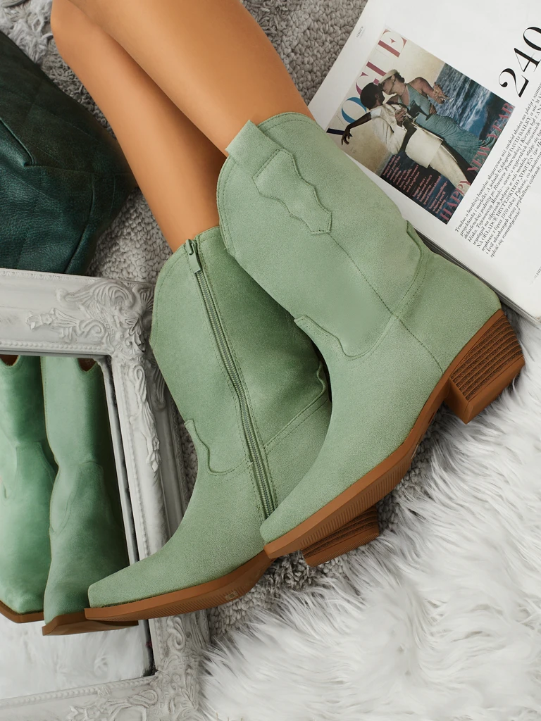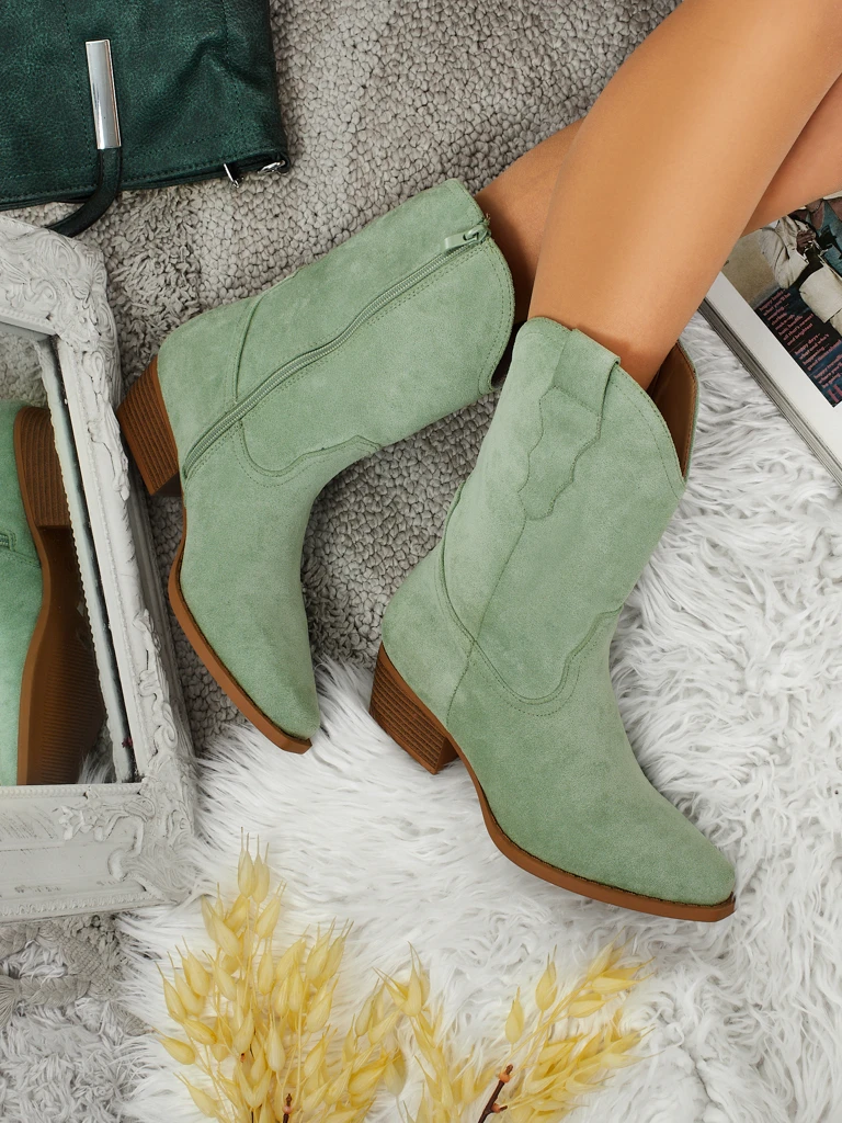 - Botine tip cowboy cu toc plat, confecționate din piele ecologică întoarsă. Au branț din material textil și se închid cu fermoar. Se potrivesc cu multe stiluri feminine!