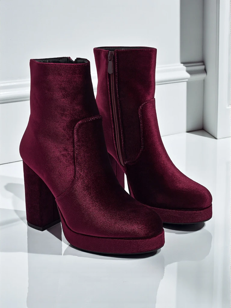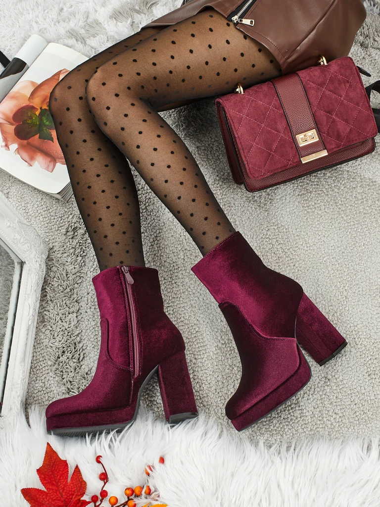 - Botine comode cu toc gros, confecționate din material textil tip velur. Modelul se închide cu fermoar. Are o izolație delicată sub formă de blană. Alegerea ideală pentru toamnă!