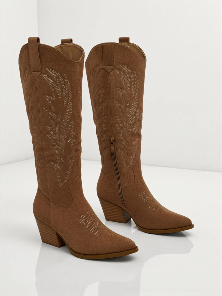 Cizmele cowboy Siena sunt fabricate din material sintetic de înaltă calitate, care imită perfect pielea întoarsă, asigurând durabilitate și ușurință în întreținere. Interiorul pantofului este căptușit cu țesătură textilă moale, garantând confortul la purtare pe tot parcursul zilei. Talpa solidă din plastic asigură stabilitate și aderență, iar tocul stabil de tip bloc, cu o înălțime optimă, adaugă eleganță fără a sacrifica confortul. Cusăturile precise și atenția la detalii, cum ar fi modelele brodate caracteristice de pe partea superioară și deget, subliniază caracterul artizanal al încălțămintei și calitatea înaltă a manoperei.