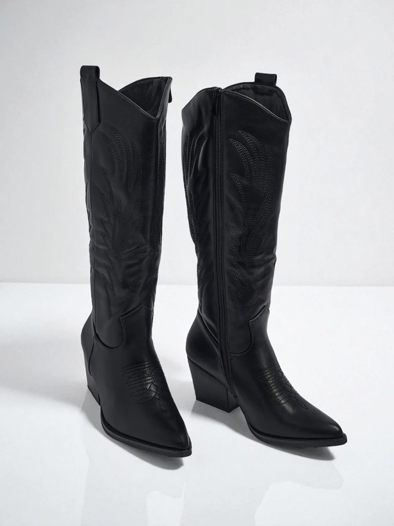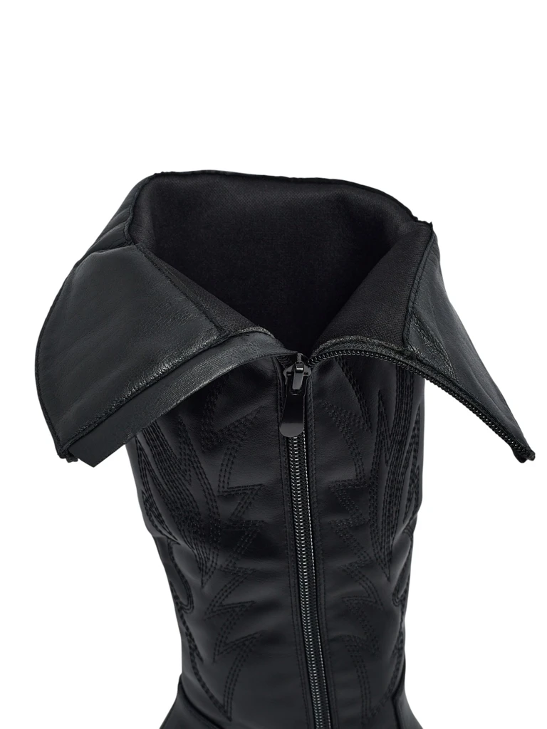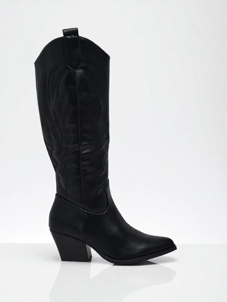 - Cizme tip cowboy cu toc, confecționate din piele ecologică întoarsă. Încălțămintea se închide cu fermoar și are căptușeală textilă. Se potrivesc cu multe stiluri feminine!
