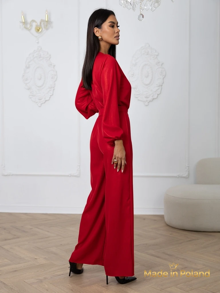 - Eleganță și confort într-un singur articol vestimentar! Salopetă de damă confecționată dintr-o țesătură plăcută, cu fir brocart. Partea superioară are decolteu petrecut și mâneci lungi. Pantaloni largi cu elastic în talie. Include și o curea. Perfectă pen