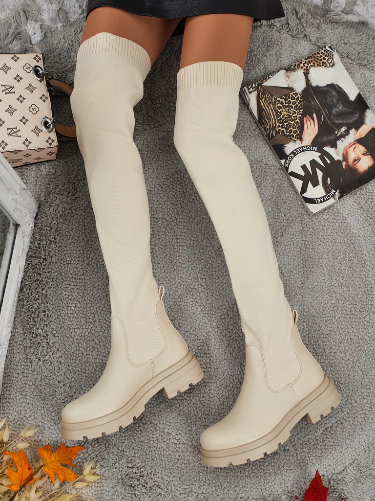 - Cizme elegante de damă peste genunchi, cu toc plat. Partea superioară este confecționată dintr-un material textil elastic, cu inserții din piele ecologică, iar în interior are o căptușeală textilă. Model slip-on. Perfecte pentru ținutele de toamnă de zi c
