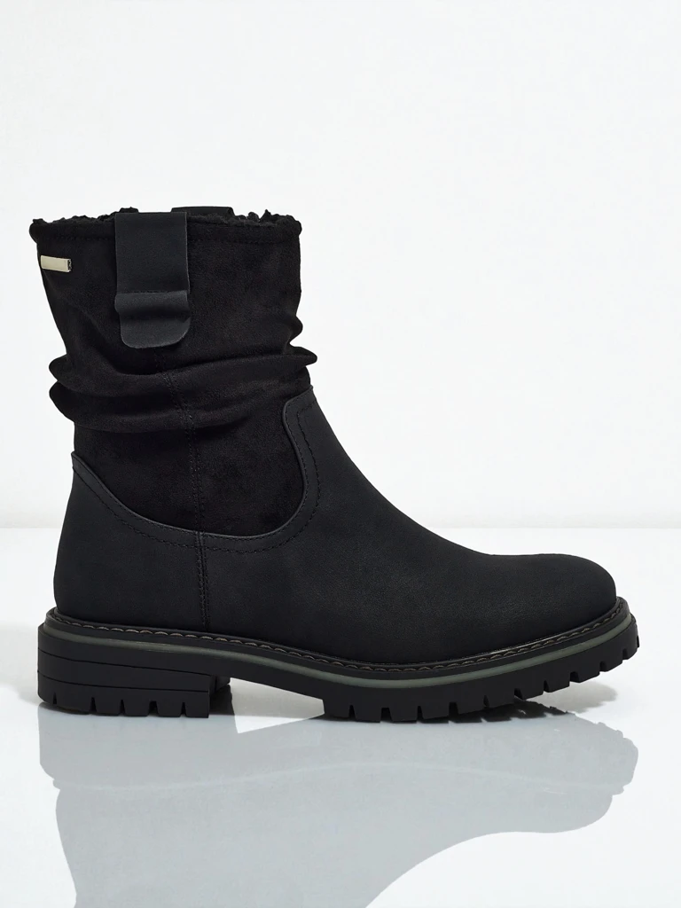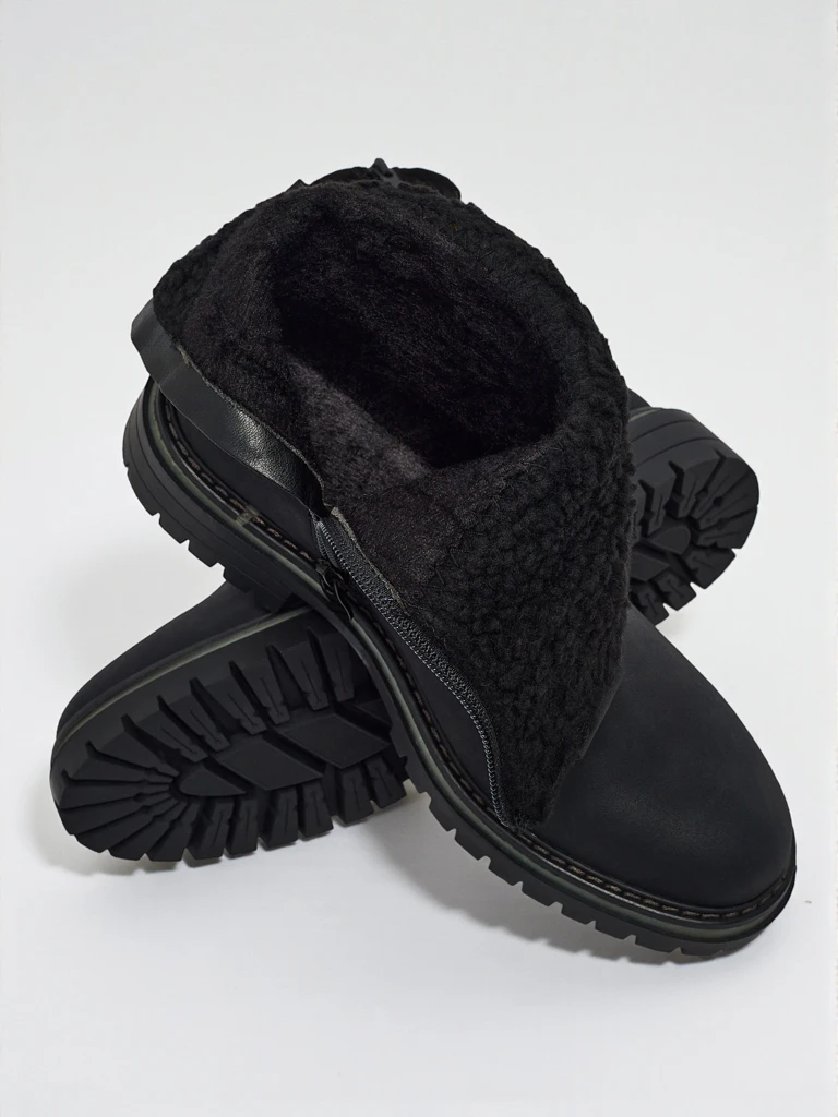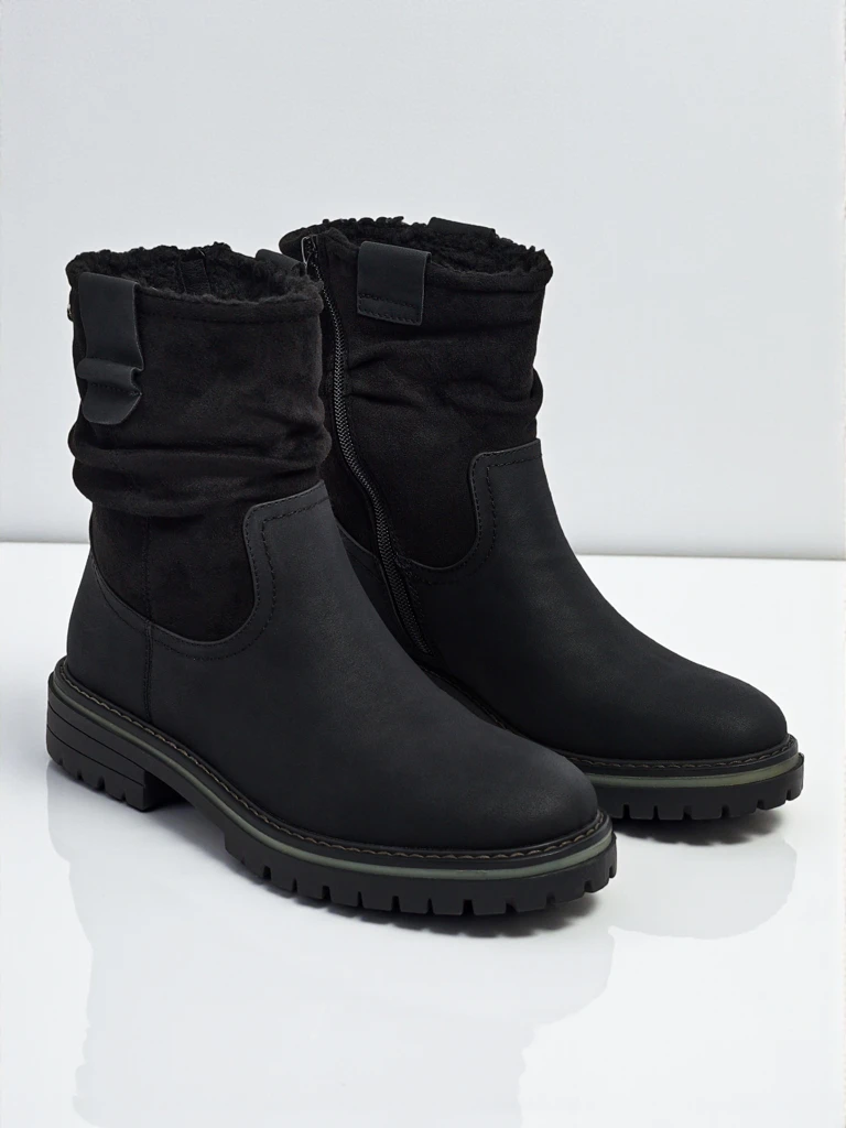 - Botine de damă cu fermoar. Modelul este confecționat din piele ecologică de tip piele întoarsă, cu talpă plată. Are izolație tip blană artificială. Decorate cu o parte superioară ușor încrețită. Confortabile și stilate, perfecte pentru toamnă!