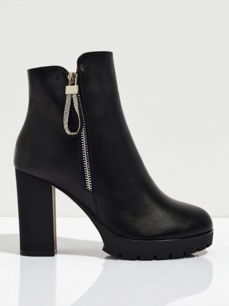 Confecționate din piele ecologică de înaltă calitate, botinele se caracterizează printr-un finisaj atent. Echipate cu un fermoar solid, facilitează încălțarea și descălțarea. Pielea ecologică face ca pantofii să fie atractivi ca aspect și, în același timp, practici. Tocul gros de 10 cm asigură stabilitate și confort la purtare.