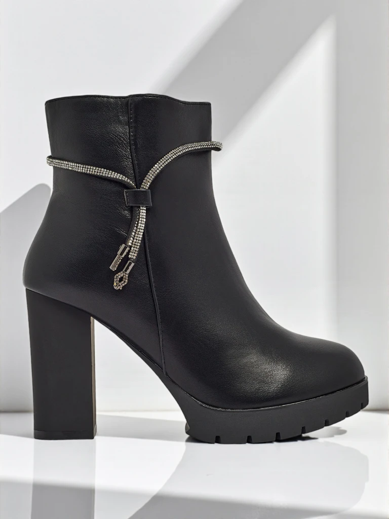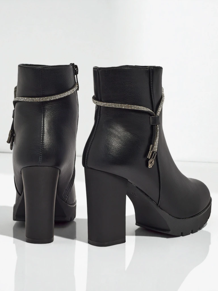 - Botine comode cu toc gros, realizate din piele ecologică. Modelul se închide cu fermoar. Modelul este ușor căptușit cu blană artificială și are un fermoar decorativ cu zirconii. Alegerea ideală pentru toamnă!