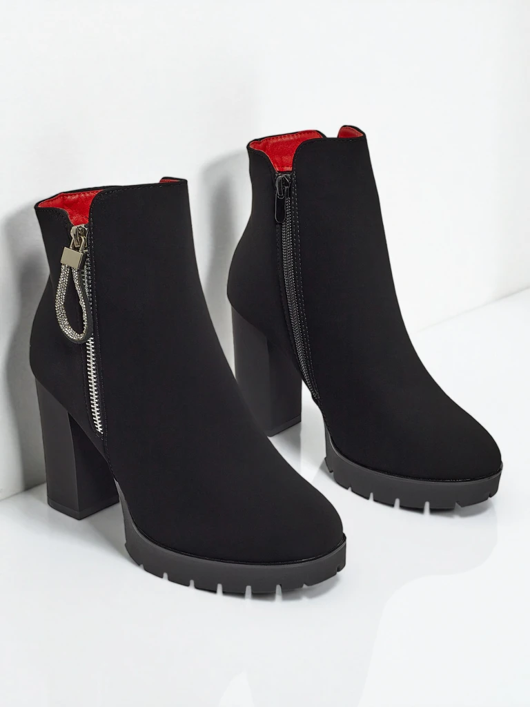- Botine comode cu toc gros, realizate din piele ecologică. Modelul se închide cu fermoar. Modelul este ușor căptușit cu blană artificială și are un fermoar decorativ cu zirconii. Alegerea ideală pentru toamnă!