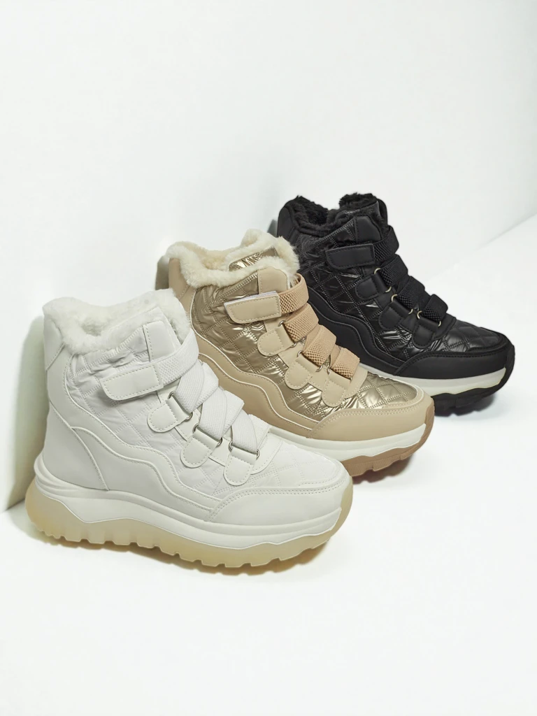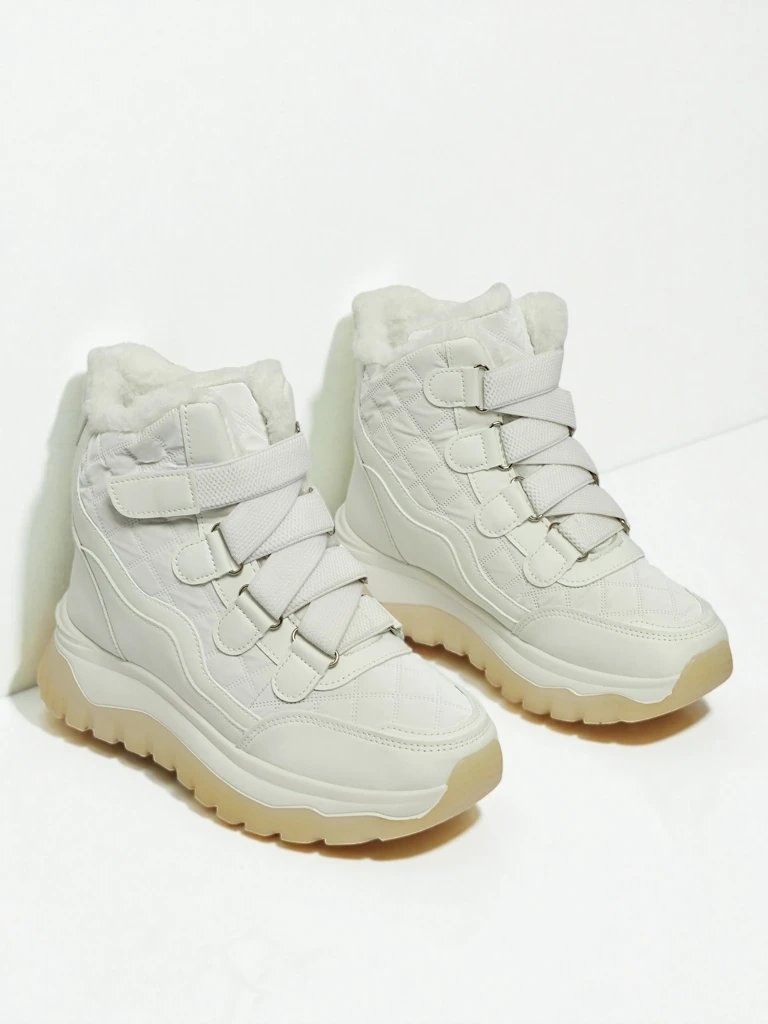 - Botine de iarnă excelente pentru femei, tip snowboots, cu talpă groasă tip platformă. Partea superioară este confecționată din piele ecologică și material matlasat, interiorul este izolat cu blană artificială. Modelul se închide cu velcro. Bază ideală pen
