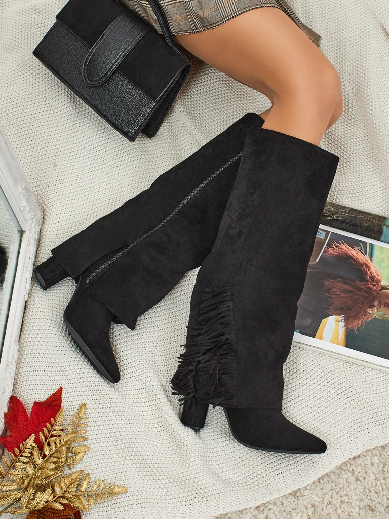 - Cizme de damă cu toc, cu vârf ascuțit, confecționate din piele ecologică de căprioară și cu o parte superioară decorativă suplimentară cu franjuri. Încălțăminte cu fermoar, căptușită cu blană în interior. Se potrivesc cu multe stiluri feminine!