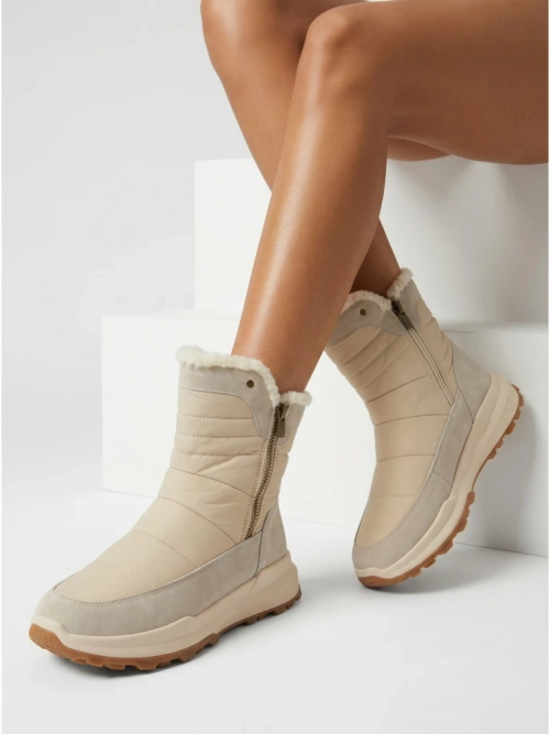 - Excelenți pantofi de iarnă tip snowboots pentru femei, cu talpă groasă. Partea superioară este confecționată din piele ecologică și țesătură lucioasă, interiorul este izolat cu blană artificială. Modelul se închide cu fermoar. Bază ideală pentru iarnă!