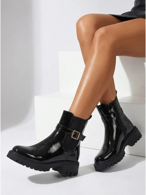 - Botine de damă cu fermoar. Modelul este confecționat din piele ecologică lăcuită, cu talpă plată. Are izolație tip blană artificială. Confortabile și stilate, perfecte pentru toamnă!