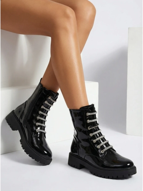 - Botine de damă din piele ecologică lăcuită, cu fermoar și șireturi decorative și vârf rotund, plus izolație sub formă de blană - modernitate, confort și stil într-unul singur.
