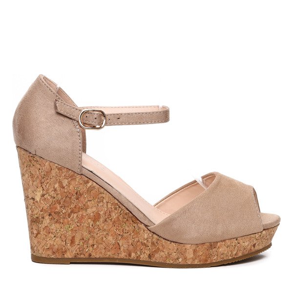 - Eleganckie sandały na koturnie wykonane z ekologicznego zamszu. Koturn wykonany z materiału korkowego. Wkładka z ekologicznej skóry. Model zapinany na sprzączkę, która znajduje się z boku.