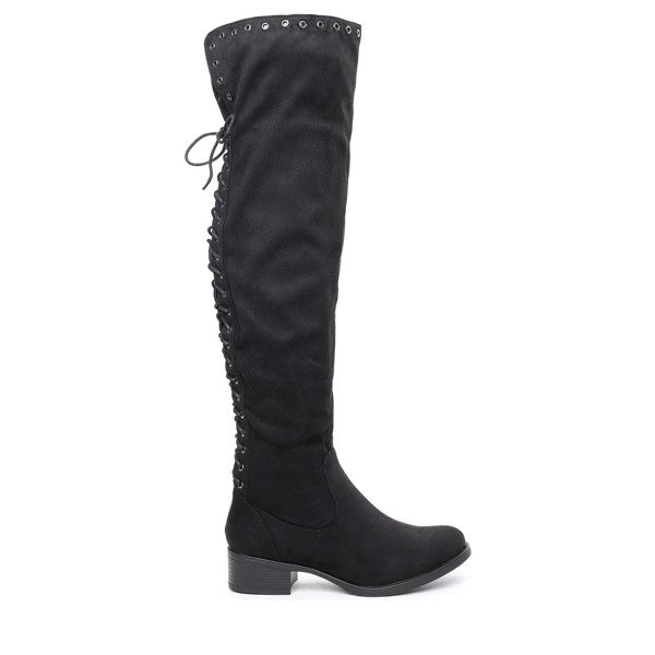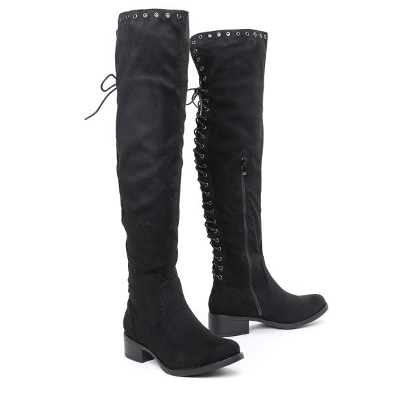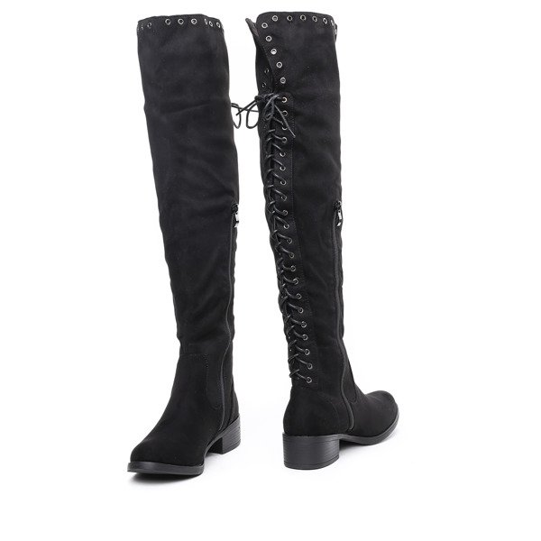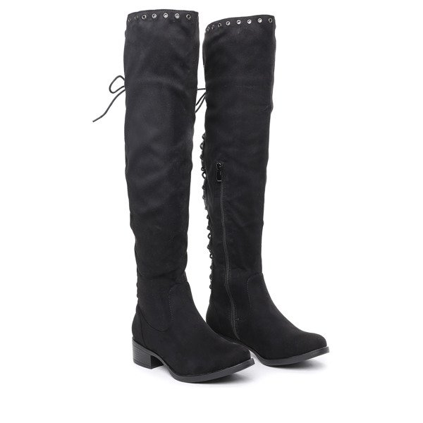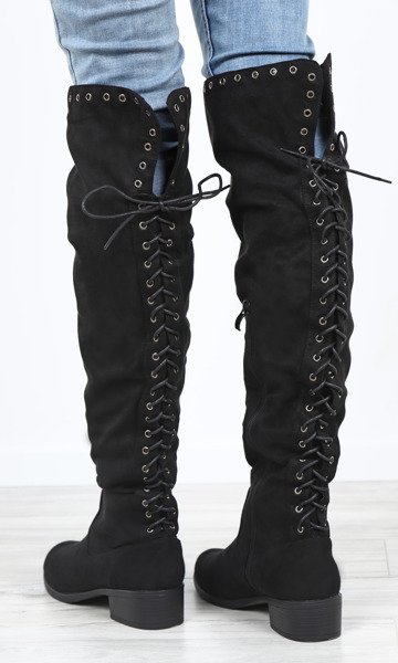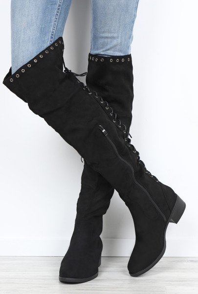 • Wyjątkowe, długie kozaki na płaskim obcasie i wykonane z ekologicznego zamszu. Obuwie zdobione przelotkami i wiązaniami z tyłu i zapinane jest na suwak z boku. W środku delikatne ocieplenie w formie futerka. Pasują zarówno do spodni jak i spódniczek.