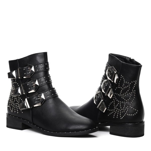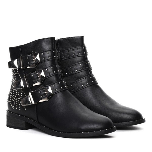 • Niepowtarzalne botki zdobione dżetami. Delikatny, płaski obcas. Obuwie wykonane z ekologicznej skóry. Na cholewce ozdobne trzy paski. W środku delikatne ocieplenia w formie futerka.