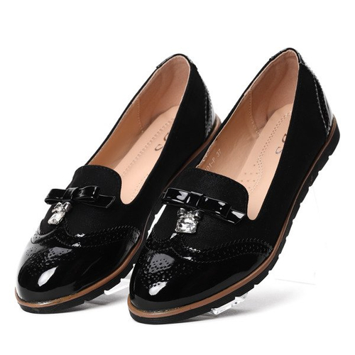 - Urocze mokasyny wykonane z połączenia miękkiego zamszu ekologicznego oraz materiału lakierowanego. Na cholewce ażurowe zdobienie, kokardka i srebrna zawieszka z cyrkonią. Dodatkowo specjalna wkładka z poduszeczkami idealnie dopasowuje się do stóp.