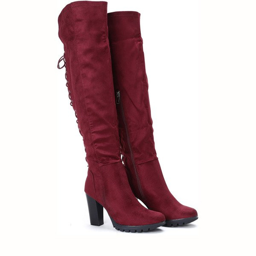 • Długie kozaki na słupku wykonane ze skóry ekologicznej zamszowej. W środku ocieplenie w formie futerka. Model zapinany na suwak po boku. Z tyłu posiadają ozdobne wiązanie.