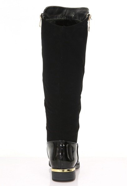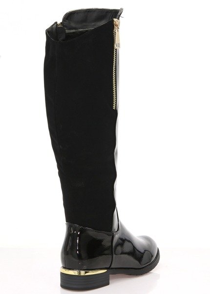 - Ghete lungi inspirate de muschetarii clasici. Spatele superiorului din piele de căprioară sintetică mată. Un fermoar decorativ, auriu și o placă de aur în călcâi creează un design elegant. Încălzire în interior.