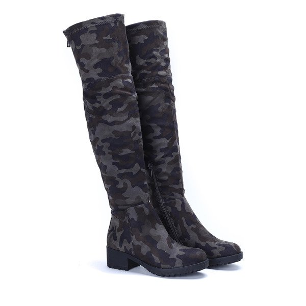 • Długie kozaki na niskim słupku wykonane ze skóry ekologicznej zamszowej. Cholewka zdobiona we wzorze moro. Model zapinany na suwak. W środku posiadają ocieplenie w formie futerka. Idealnie się sprawdzą na chłodniejsze dni!