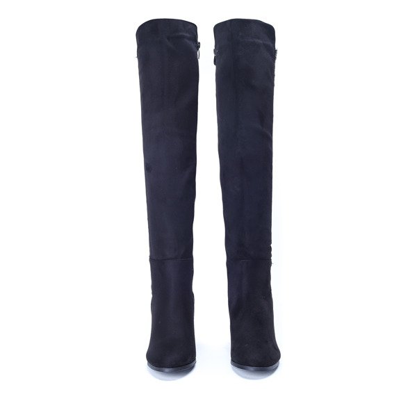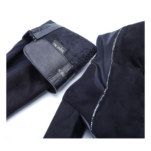 - Długie kozaki na słupku wykonane częściowo ze skóry ekologicznej zamszowej oraz z rozciągliwej tkaniny. Model ocieplany futerkiem, który znajduje się w przedniej części buta. Zdobione małymi cyrkoniami oraz zapinane suwakiem po boku.